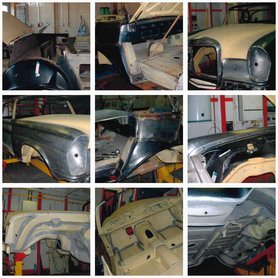 Lekértem pár tétel árát a Kárpát utcából is, konkrétan erre az alvázszámú kocsira, ezeket kaptam: stabilizátorrúd szilent 20.875 forint, stabpálca szilent 2.970, első kerékagy csapágy 13.635-18.010 forint között. Az első, tető tömítő gumi 66.350 forint, az ajtókéder 643.250 forint/darab. Erre lejjebb még visszatérünk. „Azért is fontos a gyári alkatrészek használata, mert az utángyártott alkatrészek/lemezek nem illeszkednek, sok utómunkát igényelnek. Feltettük például a belső, utángyártott doblemezt, majd rá a külső sárvédőt. Természetesen nem illeszkedett, így fordítva csináltuk. Először csavarokkal rögzítettük a külső karosszéria elemeket, hogy vonalba fussanak az élek, jók és pontosak legyenek az illesztések. Majd ehhez igazítottuk a belső doblemezt. Az ülések és a lábtér alatti rész ugye dupla fenéklemez, de a kabrioletnél a kardánbox is végig három (!) milliméter vastag lemezből készült, szemben a kupén ugyanezt az alkatrészt egy milliméteresből nyomták.
