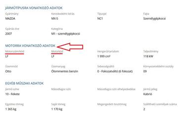 a forgalmiban csak motorkód szerepel, a motoron viszont van olvasható motorszám (egyedi azonosító)