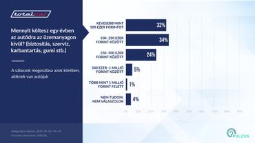 Az autótulajdonosok 34 százaléka 100-250 ezer forintos kiadásról beszélt, ők vannak a legtöbben. Nagyon közel van hozzájuk a 100 ezer forint alatti összeget költők tábora, akiknek az aránya 32 százalékot tesz ki. Jelentős, 24 százalékos a 250-500 ezer forintos autósok tábora. Tehát 90 százaléka az autósoknak 500 ezer forint alatti összeget fordít az autó fenntartására. Emellett 5 százalékuk a fél- és egymillió közötti sávba sorolható, 1 százalékuk pedig 1 millió forintnál is többet költ.