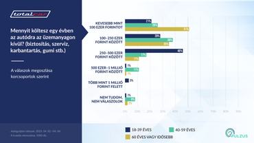Látványos eredmények születtek a különböző korosztályoknál. Kimagasló az alacsony kiadással autózók aránya az idősek körében. Ugyanakkor a fiatalok a 250-500 ezres sávban vannak masszív fölényben. Ráadásul csak közöttük vannak olyanok, akik 1 millió forint feletti autóköltségről beszéltek.