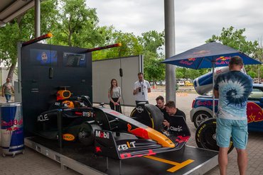 A Red Bull hozott egy csonka Forma-1-es versenyautót, amin bárki kipróbálhatta, hogy mennyire lenne ügyes a versenypálya boxutcájában. Időre ment, nem hagyhattam ki. Szabó barátommal – aki amúgy gumis – végül 7,6 másodperc alatt cseréltük le a kereket, ami bár nem tűnt rossz időnek, végül az akkori állás szerint csak a harmadik helyre volt elég. Az derült ki, hogy valójában ez három emberrel lenne ideális: egy ember csavaroz, egy veszi le a használt kereket, egy pedig a helyére teszi az újat.