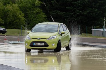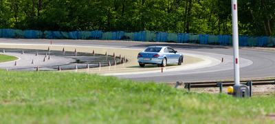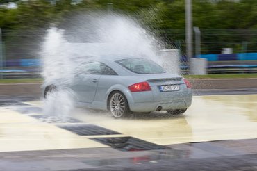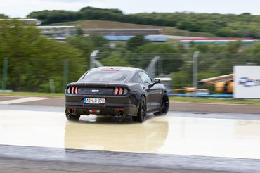 A szlalomban az a poén, hogy a bóják egyik oldalán száraz aszfalton tapadnak a kerekek, a másik oldalukon nedves gyantán csúsznak. A talaj változó, a pilóta menet közben alkalmazkodik: könnyű elhinni, hogy jót fog a gumi az aszfalton, aztán jön a meglepetés, hogy mennyire nem akar megtapadni a locsolt műgyantán. A kezdeti meglepetést már néhány kör után rutin váltja, és a lényeg is pont itt van: a vezetéstechnikai tréning felkészít ezekre a helyzetekre, így a sofőr pánik helyett megfelelő reakcióval válaszolhat.