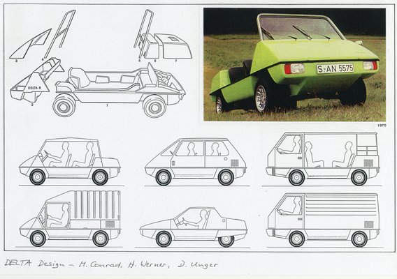 A három német fiatal által megalapított stuttgarti Delta Design Studio ebben az időszakban tevékenykedett, ötleteik ebben a korban születtek. Nagy lelkesedéssel dolgoztak több prototípuson és az autó és az autózás jövőjét előremutató koncepción is – egy következő cikkben bemutatom azokat is, ígérem, érdekesek lesznek. Mindegyik komoly ötletük eljutott a működőképes prototípus fázisig, az NSU TT motoros kétüléses roadsterükről, a Delta 1-esről itt írtam.
