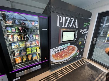 Kalkuláltunk, és úgy jött ki a lépés, hogy ismét Meggenhofenben töltjük csőre a BYD-t. A fogyasztás sokkal unalmasabban alakult, mint vártunk: a kitérővel együtt is hajszálpontosan ugyanannyit kért a Seal, mint korábban, vagyis 23,5 kWh-t. Birizgálta a fantáziánkat a hatalmas töltőkomplexum melletti pizzaautomata, ezért megnéztük, hogy milyen. A művelet végül nem lett zajos siker: Sipi pizzája hibátlan volt, az enyémet viszont hidegen köpte ki a gép, így végül csak egyet tudtunk megfelezni. Sofőrt váltottunk, Meggenhofentől én vezettem, addig se zavart annyira, hogy éhes vagyok. A biztonság kedvéért vettem egy kétlövetű Mars csokit az útra, az jól működött.