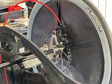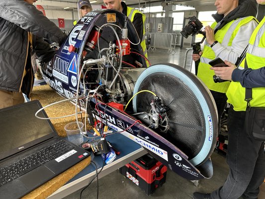 Ehhez alapnak szénszálas vázat használtak és szuper könnyű futóműelemeket. Szépen kidolgozott minden, a küllős biciklikerekeken szénszálas burkolat van és már dolgoznak a karbon felniken is. A hajtás hibrid, saját fejlesztésű dízelmotor dolgozik amikor a rendszer megköveteli és csupán 30 milliliteres tank tartozik hozzá, nem is kell több. A blokk egyedi fejlesztés és külső cégek – illetve az egyetem – támogatásával készültek az alkatrészei. Nagyjából 80 köbcentis, ötszelepes, négyütemű, nyomórudas dízelmotor ez, a csapat szerint 1 kW körüli teljesítménnyel. A hengeren még csak hűtés sincs, alkalmanként 3-4 másodpercre indul be, ahhoz meg minek? Sőt, szivacsokkal még melegen is tartják, így nem hűl ki annyira két start között.