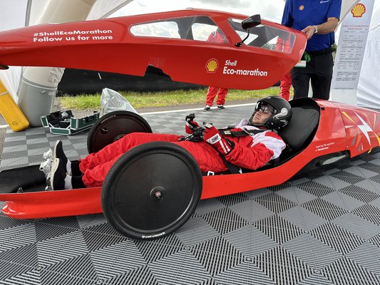 Gyakran felhúzott szemöldökkel figyeltük, ahogy a versenyzőket belepréselték egy ilyen apró kapszulába, aztán végül nekünk is kijutott az élményből. Egy prototype kategóriás autóba fekhettünk be, amit a Shell próbajelleggel épített. Kaptunk versenyruhát, hajhálót és sisakot, majd becsomagoltak minket és ötpontos biztonsági övvel rögzítettek, ami meglepő eljárás ahhoz képest, hogy a 40-et sem lépjük túl. Mélyen feküdtem az autóban, az ülés is csak egy fél kübli és előreszegett fejjel próbáltam kilátni a plexi ablakokon. A botkormány közvetlenül a combjaim felett van és a gázt egy elektromos rollerekéhez hasonló potméterrel nyomom. Volt előttem egy kis kijelző a sebességhez, de nem sokat tudtam foglalkozni vele, lekötött a taktikázás.