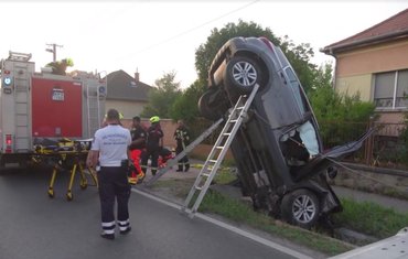 Hírek baleset 2024. 08. 21. 17:27 Függőlegesen, az orrán állt meg egy autó Budapesten Az idős sofőrt a tűzoltók szabadították ki az autóból, amit létrákkal kellett kitámasztani.