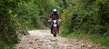 Szoknom kellett hogy ereszkedésnél ne használjam a hátsó féket, olyankor ugyanis blokkoló hátsóval csúszás helyett simán előfordult, hogy állóra lassultam a meredek lehajtón. Hát ja, alacsony tömeg, jó gumik, miért is csúsznék? Szóval inkább az első fékkel mentem a lefelékben, mert úgy könnyebben tudtam egész testtel mozogni, és két ujjal is patikamérlegen tudtam adagolni a fékerőt, nem fenyegetett a veszély, hogy hirtelen blokkol, én pedig bukfencezem előre. Tökéletesen éreztem a tapadást és a nyomáspontot – terepen ezek az apróságok a fontosak.