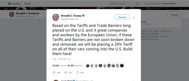 Hírek usa 2018. 06. 23. 11:44 Trump brutális védővámot lengetett be az európai autógyártóknak Hol máshol, a Twitteren. Most már tényleg az autógyártók jöhetnek a vámháborúban.