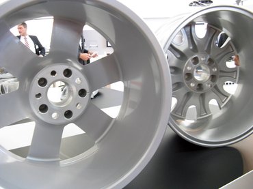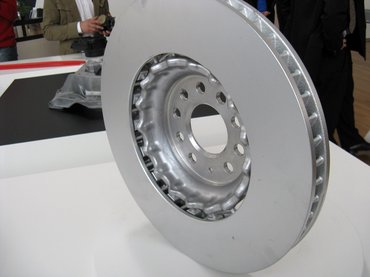 A tömegcsökkentés illusztrálására ezután rézkábelt hasonlítunk össze az alumíniummal, öntött és kovácsolt alufelniket emelgetünk. Mint kiderül, az Audi felnijei darabonként 2,2 kilóval könnyebbek, mit a konkurensé, és ez valóban óriási eltérés, mivel rugózatlan és ráadásul forgó tömegről van szó. Még ennél is többet spóroltak a hibrid féktárcsákkal, amelyek agyrésze alumínium, maga a tárcsa acél. Ez kerekenként 3,75 kiló csökkentést hozott.