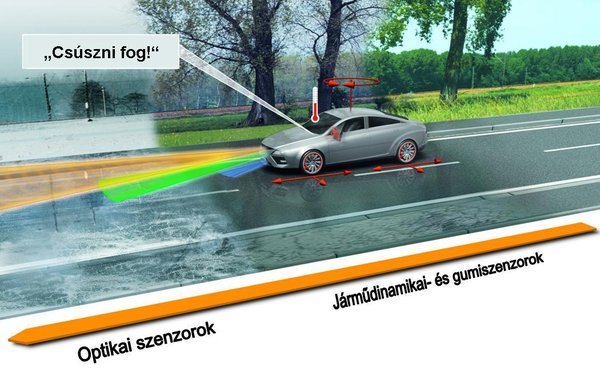 Az optikai és a hőmérőszenzorok fúziójával már tényleg előre megmondhatjuk, hogy csúszik-e az út. Az igazán jó vezetéstámogató rendszer azonban mindaddig észrevétlen marad, amíg valóban szükség nincs rá. Fölösleges lenne a rettentő óvatosan, araszolva közlekedő sofőrt pittyegéssel, villogással és bimbammolással tovább stresszelni. Ehelyett akkor kéne jelezni, ha az adott útviszonyokhoz megválasztott sebesség, illetve járműdinamika mellett a tapadási határ közelébe érünk.