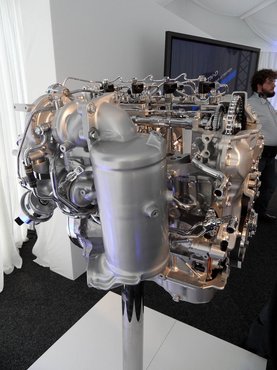 A motor teljesen új, láncos vezérléssel, könnyűfémből. A furat kisebb, a löket nagyobb, mint volt, ennek ellenére impresszív, hogy mennyivel könnyebb a dugattyú és a hajtórúd. A szelepvezérlés változó, a kipufogóoldalon hidraulikus működéssel, a szívónál a gyorsaság érdekében elektromos aktuátorral.