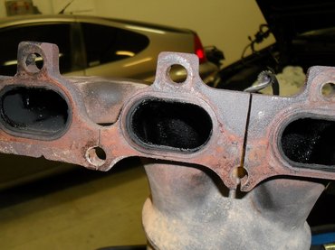 A látvány magáért beszél. Megvan a magyarázat arra is, miért volt mind a négy gyújtógyertya olajos. A motor bontása közben észrevettem, hogy a kipufogóöntvény el van repedve. Mivel a katalizátort is tartalmazza az egység, annak meghegesztetése mellett döntöttem. Ugyanakkor kétséges volt, hogy az olajsokk után képes lesz-e még ellátni a feladatát, megfelelőek lesznek-e az emissziós értékek?