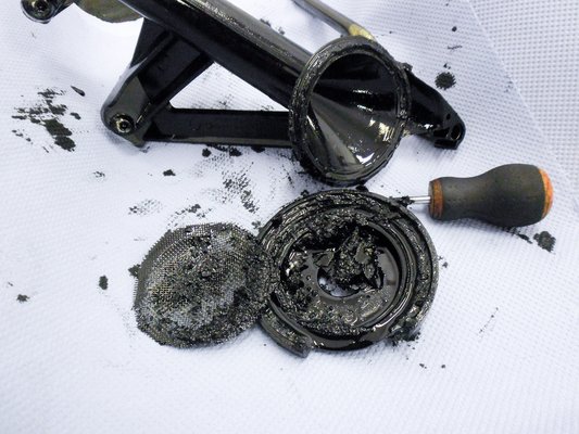 Az első meglepetés a munka során az olajleeresztő csavar kitekerésekor ért. Az olajteknőből csordogáló folyadék (motorolajnak nem nevezném) állagához hasonlót még sosem láttam, pedig szervizeltem valaha kamionokat is, 80 ezer kilométeres szervizciklussal. Az olajszűrő állapota szintén nem volt valami szép. Pedig a java csak az olajteknő leszerelése után következett.