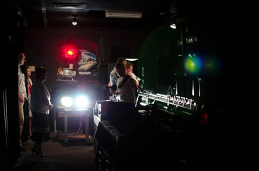 A Tungsramban tett látogatás második része a fejlesztő részleg megtekintése volt. Gondolom a fényképek is jól visszaadják, hogy elég sötét helyre keveredtünk, minden egyes helyiséget fekete drapéria borított, fekete bútorokkal és mérőeszközökkel. Az eszközök nevével nem szeretnék senkit sem terhelni, mindenesetre az árván ácsorgó izzó körül gömbfelületen mozgó fényérzékelők tökéletesen alkalmasak arra, hogy például a már említett ezer lumenes fényáramot kimérjék, sőt, a fejlettebb berendezés a fényeloszlás pontos mérésére is képes.