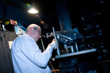 Ezután felszerelték a berendezésre a 4Runner lámpatestét. Megtudtuk, hogy az üvegen lévő négy bütyök a mellette lévő számmal a beállítást szolgálja. Egy kis négylábú alkalmatosság lábait kell a számskálán beállítani a számhoz, majd a bütykökre illeszteni. Esetünkben egy lézeres mérőfej került a négylábú izébe, ennek segítségével lehetett beállítani pontosan a lámpa helyzetét.