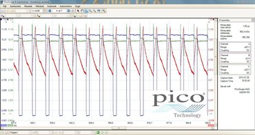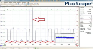 A nyomásszabályzó-szelepet vizsgálva fura mérési eredményt kaptam. A minimális áramfelvételéből (piros hullám) látszik, hogy most a rendszernek ez az áramköre nem működik. Az ilyen beavatkozók általában kapnak egy 12 voltos (inkább az akkumulátor kapocsfeszültségével egyenértékű) pozitív tápot, és a motorvezérlő elektronika a testelés kapcsolgatásával működteti őket. Az oszcilloszkóp felvételen látható, hogy a pozitív tápfeszültséget (zöld) megkapja a mágnesszelep, de a testvezérléssel gond van. 4,2 voltos négyszögjelet mértem, ami néha normális értékre változott (piros nyíllal jelölve). Ez egyszerűen annyit jelent, hogy nem záródik az áramkör. Mintha szakadt lenne a mágnesszelep tekercse. Azt viszont már a vizsgálat elején ellenőriztem, alapfeladat egy ilyen hiba esetén.