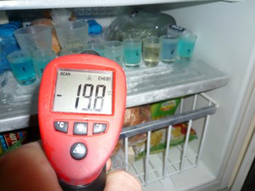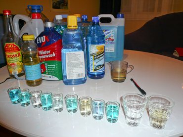 A frigónk kábé mínusz húsz fokot tud, ezt egy lézeres hőmérő segítségével állapítottam meg. Kiporcióztam egy-egy pohárkát mindegyik flakonból, hígítottam, ahol kellett, és egy éjszakát adtam nekik, hogy megfagyjanak. A kilenc ablakmosóból hat meg is fagyott, és a pálinka is. Volt, amelyik szálkásan, szinte szilárdra, volt, amelyik csak kicsit kásás lett, ezeket a szubjektív adatokat beírtam a táblázatba. Mivel volt mínusz 19 fokos és mínusz 23-as is a minták között, és a fagyás egy viszonylag szűk hőmérséklettartományban végbe menő folyamat, nem teljesen igazságos az ítélet, de én úgy érzem, ami a hőmérő szerint mínusz 19,8 fokon keményre fagy, az nem jó.