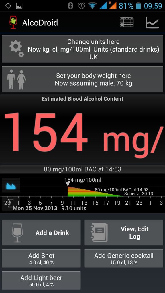 Egy átmulatott éjszaka után néha törvénybe ütközik a reggeli autóvezetés. Az előző naphoz képest kifejezetten józannak gondoljuk magunkat, már nem lépünk a saját kezünkre, de még közel sem biztos, hogy az alkohol teljes mértékben lebomlott a szervezetünkben. Alkoholszonda hiányában segítséget nyújthat az Alcodroid. Naplózhatjuk az általunk megadott egységek szerinti poharazásunkat. A program saját algoritmusa szerint kiszámolja, mennyi alkohol maradt a vérünkben. Bónusz szolgáltatás a napi, heti, havi italfogyasztás naplózása: érdekes következtetések vonhatóak le, ha visszanézzük a kocsmatörténelmünket.