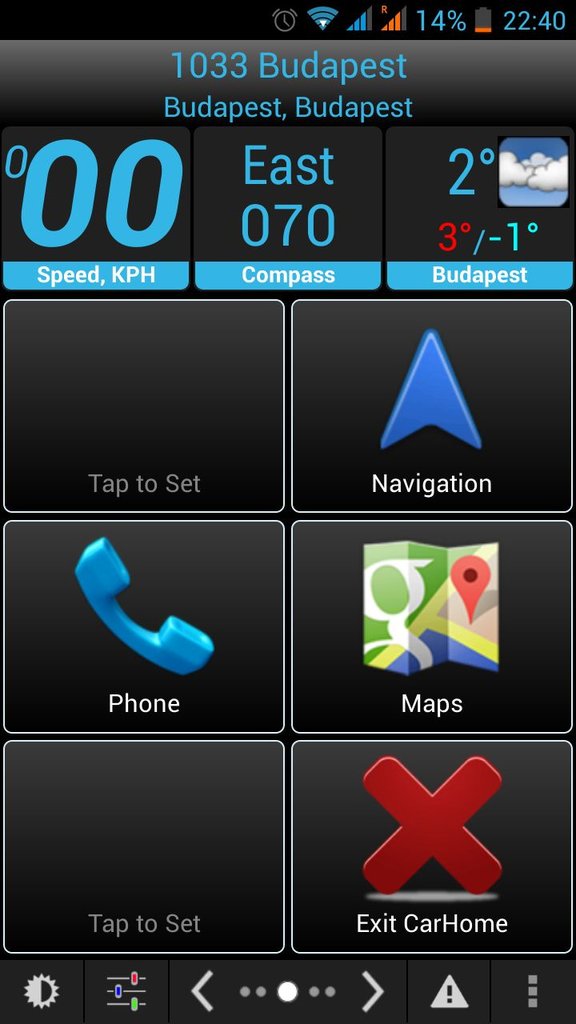 Ez az alkalmazás a telefonunk kezdőképernyőjét változtatja meg. A legfontosabb funkciókat teszi elérhetővé megnövelt gombméretekkel, továbbá a sebességünkről, a külső hőmérsékletről és a pillanatnyi helyzetünkről nyújt információt a jól látható karakterekkel megtöltött információs ablakokban. Jól jöhet út közben, hiszen nem kell menükben lapozni, vagy alkalmazások között váltogatni, minden adat és funkció egy képernyőn jelenik meg. A harminc napos próbaidő után, ha szeretnénk megtartani a programot, 900 forintot kell fizetni érte.