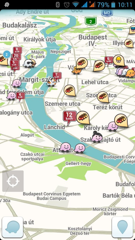 A Waze közösségi navigációnak aposztrofálja szolgáltatását, és igaza van. A térképszolgáltatás alapjai megegyeznek a Google Maps rendszerével, de a Waze saját térképadatbázist üzemeltet. A Google-nek annyira megtetszett a dolog, hogy idén júliusban már össze is borult a két cég, közösen fejlesztik a Waze-t. A legnagyobb előny abból származik, hogy a térképet érintő változások legkésőbb három nap alatt megjelennek a mobiltelefonunkon, hiszen a sok felhasználó lázasan küldi a központba a forgalmi újdonságokat (útjavítások, útlezárások, balestek, sebességmérő kamerák, stb.). Az alkalmazásban láthatjuk a Waze rendszerébe bejelentkezett sofőröket, jelentős cukiságfaktorral rendelkező avatárokkal felruházva. Ha kedvünk tartja, akár üzenetet is küldhetünk Wazer pajtásaink autójára kattintva. Zseniális találmány.
