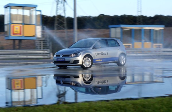 Az első feladathoz egy 12%-os műgyantás lejtőhöz álltunk, ahol a tapadást 0,4-es μ-értékűnek mondták, vagyis amolyan nyálkás aszfaltnak felelt meg: jobban tapadt, mint a jég, de egy átlagos vizes útnál sokkal rosszabbul. A nyári (Goodyear) gumis, fekete Golfot megversenyeztették a kaptatón a fehér, UG9-eseken guruló Golffal, és lám, a téli gumival fél másodperccel hamarabb lehetett felmenni a hegyre. Aztán mi is legurulhattunk, és a lejtő alján lévő kanyarban a nyári gumival rendre kicsúsztunk a javasolt sebességgel, miközben a télivel pont be tudtuk venni.