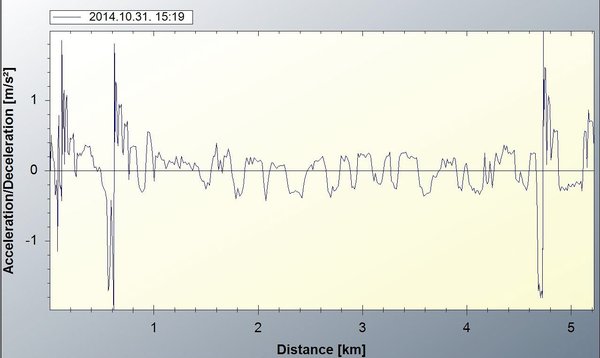 Belenagyítottam kicsit a gyorsítási/lassítási lázlapba, amit a két menetben felvettem, és egyértelműen látszik is a különbség: 2 m/s2-nél nagyobb hosszirányú gyorsulásra nem is volt szükség öt kilométer alatt, amikor nyugisan mentem – ezt jó gumival még jégen is el lehet érni. Amikor rohantam, ugyanezen a szakaszon jóval ziláltabb a görbe, és kétszer akkora maximális gyorsítási/lassítási értékeket produkáltam.