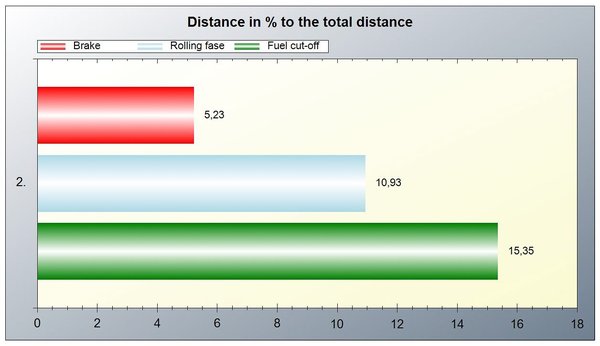 A két szélsőséges vezetési stílus között itt is mérhető különbség van: elővárosi forgalomban spórolásra kihegyezve több, mint a megtett út tíz százalékát, vagyis közel három kilométert gurulva tettem meg, és mindössze öt százalékban fékeztem. Sietősen ez megfordult, 15 százalékban fékeztem, és ötöt se gurultam. Mindehhez hozzájön 30 százaléknyi motorfék, ami persze pillanatnyilag nulla fogyasztással jár, de akkor is elfűtjük a mozgási energiánkat, amit később megint üzemanyaggal kell pótolni.