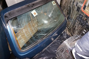 A tesztberendezés hamar összeállt, hoztunk egy Fiesta hátsóajtót a bontóból, természetesen működő ablaktörlővel, feltettünk egy használt, de jó állapotú lapátot meg egy kapcsolót a vezetékre, illetve bekészítettük a legnagyobb ventilátort, amit a szerkesztőség környékén találtunk. A cél az volt, hogy minél nagyobb vihart kavarjunk az üveg előtt, mivel a menetszélnek komoly hatása van a ráfagyásra.