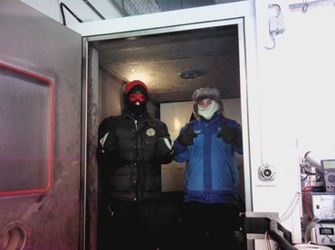 Végül ruházatilag annyira rákészültünk, hogy simán bírtuk a mínusz 17-et, csak cipőben voltunk gyengék, de negyedórás etapokban végigcsináltuk a mérést folyamatosan hűtött kamrában, állandó mínusz 16-17 közötti hőmérsékleten. A szélvédőre is tettünk hőmérőt, így mindig tudtuk ellenőrizni, hogy minden rendben van-e.