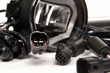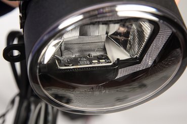 A szép dobozban benne a két lámpatest, kábelek, szerelék és egy elektronikus egység. Maguk a lámpatestek teljesen zárt egységek, vízállóak. Az üveg műanyagnak néz ki, de annyira masszív, hogy az is lehet, valami valódi üveg. A lámpatesthez csatlakozó kábel egy pvc-csőben fut, és teljesen vízzáró csatlakozója van. Az elektronikus egységet a szokásos 12 V és test, valamint kapcsoló mellett az irányjelző kábeljeire is rá kell csatlakoztatni, innen veszi a jelet a kanyarfény, ami nem más, mint az indexekkel bekapcsolódó azonos oldali ködlámpa. Ez azonban csak akkor működik, ha a tompított fényszóró is be van kapcsolva, ehhez is van nyilván egy jelszál, amit be kell kötni.