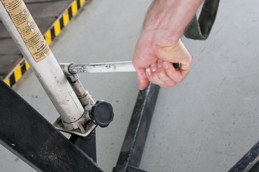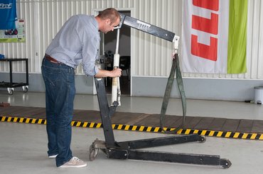 Általában lapra hajtva kapod, úgy könnyű fal mellett, állítva tárolni, fektetve szállítani az autóban. A két lába lehajtható, egyszerű csapszeggel marad a helyén, onnantól, hogy a rögzítés benn van, gurítható és stabil lesz. A darurész teleszkóposan csúszik ki, attól függően, milyen mélyre kell nyúlni a motorért, az emelést pedig egy éppolyan hidraulikus teleszkóp végzi, mint amilyen a krokodilokon, azaz az olajemelőkön van, csak itt hosszabb az útja. Természetesen a daru karját is csapszeg tartja a helyén kicsúszás ellen, hiszen ezeken a cuccokon minden ugyanazzal a logikával működik.