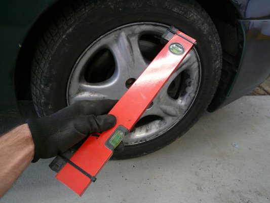 Kettes számú háztáji műszerem egy akciós vízmérték, amelyre rákötegelőztem a két kihúzott végdarabját, így hozzá tudom állítani a felnimérethez. Biztos pontra kell támasztani, hogy alul és felül ugyanoda feküdjön fel, majd a tetejét elhúzva a buborék segítségével megkeresni a függőlegest. Ha nem akarunk közben fényképezni, viszonylag könnyű sublerrel (akinek nincs, használhat tolómérőt is) megmérni a különbséget, ha bizonytalanok vagyunk, kikereshetjük a krovakészletből a hézagba éppen illeszkedő dugókulcsot, és annak mérjük meg a külső átmérőjét. Innentől megint csak egy koszinusz választ el a fokban mért értéktől: a Mareánál koppra bedöntve 2,5 fok lett, amit utcára már nem ajánlanék, pályázni viszont még kicsit kevés, főleg a mi karosszériadőlésünkkel, de ennyit adott ki a geometria.