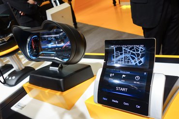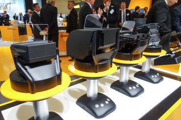 Tovább a Continental csupa sárga területére, e cég nemcsak autógumikat gyárt, hanem fontos elektromossági és elektronikai beszállító is, ez talán nem mindenkinek nyilvánvaló. Itt terjeng egy csomó műszerfal, végre látok egy LCD-st kiszerelve, ez, ha nem tévedek, egy Mercedes S osztályé. Nem is olyan lapos, mint gondoltam, összehasonlításképpen van mellette egy elektromechanikus fajta is, az alig vastagabb. Persze, hiszen kell bele háttérvilágítás is, no meg az elektronikának egy részét is beleépítették.