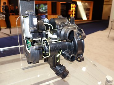 Ó, és végre felszabdalva megnézhetem, hogyan néz ki egy újfajta, a három- és annál több hűtőkörös autókhoz való, elektronikusan vezérelt termosztát, a mai motorok extrém gyors bemelegedésének egyik legfontosabb eszköze. Mintha a tévében is szerepelt (talán a Friderikusznál?) repülőgépevő ember gyomrát látnánk kiműtve a boncasztalon, olyan. És micsoda primkó kis modelljármű-villanymotor zár benne mindent! Ez bír majd ki félmillió kilométert meghibásodás nélkül?
