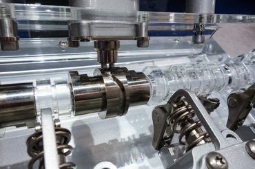 Egy másik modellen, amely csak a Schaeffler által szállított elemeket mutatja be fémi valójukban, a motor többi részét jellegtelen plexi formákként, megtekinthető, hogyan működik a vezérműtengely-eltolós változó szelepvezérléses/hengerleállítós mechanika (mert mindkettőre jó). Nézzék csak azt az íves pályát és az ujjas működtetőt!