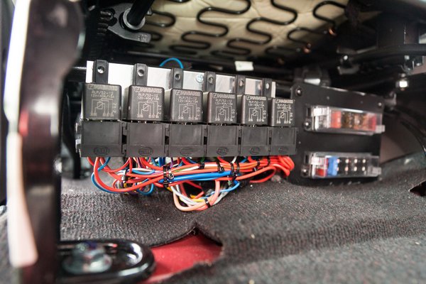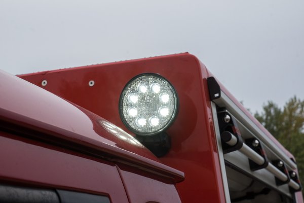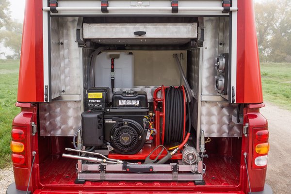 Az oldalsó (és a hátsó) málhatereket a redőny mozgatására automatikusan fel- és lekapcsolódó ledsorok világítják meg, elhelyezésükön lehetne még finomítani, kicsit vakítanak, pár fokkal érdemes lenne befelé fordítani. A málhaterek tartalma annyira nem érdekes, hiszen jó eséllyel úgyis személyre lesznek szabva. Jelen esetben az egyik oldalon két tömlő, a másik oldalon két porral oltó lakott egy háromlábú reflektor kíséretében. Utóbbi is jól mutatja, hogy demóautóról van szó, hiszen a kocsiban aggregátor nincs, a hagyományos inverter pedig igen hamar elszomorodna, ha rádugnánk az 1000 wattos technikát.
