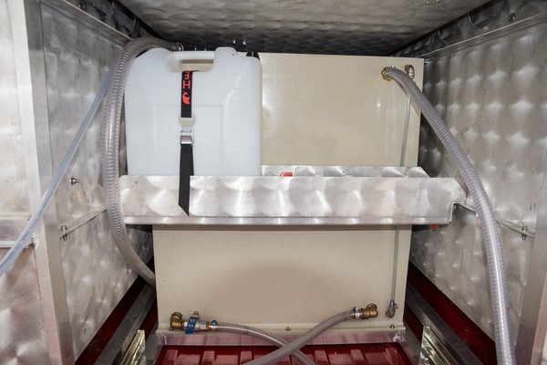 Már csak azért is érdemes lenne kisebb tartállyal adni a gépet, mivel így az oldalsó málhatérből veszi el a helyet, például a felső polcra nem fér be egy láncfűrész, amire azért rendszeresen szükség lenne. Plusz kisebb a terhelés, és nem utolsó sorban a folyadék lengései is kevésbé szólnak bele a vezetésbe. Fél köbméter víz, ha beleng, tisztességesen meg tudja mozgatni a hátulját, ami egy gyors kanyarvételnél simán bedobja a kocsit az árokba.
