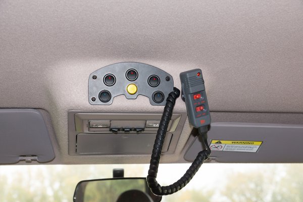 Apropó, energiaellátás. Mivel a fényhídon kívül már minden fény ledes, nem kellett kiegészítő akkut és erősebb generátort beépíteni. A fényhíd korosabb modell, Federal Signal Vama AS-380-as, hagyományos halogén izzókkal, feltehetőleg itt is a költséghatékonyság volt a lényeg; ez nem kerül egymillió forintba. A kezelőpanelen a tető és első villogók kapcsolóján kívül még a munkatér lámpák kapcsolói is helyt kaptak. A sziréna kezelője kísértetiesen hasonlít az egykori távirányítós autóm irányítójához.