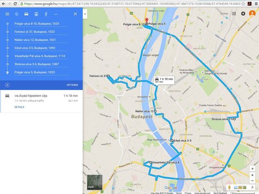 Hogy megtudjuk a választ, kollégánk, Stump Bandi tudományos alapossággal összeállított egy versenypályát. Ezen csak a hét ellenőrzőpont volt adott, a leggyorsabb utat a két eszköz tetszőlegesen választhatta meg. Volt benne belváros, érintettük a budai hegyeket, a rakpartot, aztán kimentünk a Hungária körútra is. Arra voltunk kíváncsiak, hogy a többféleképpen megközelíthető célpontok között melyik navigáció találja meg a leggyorsabb útvonalat.