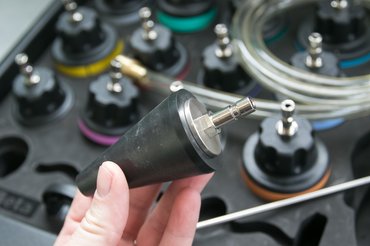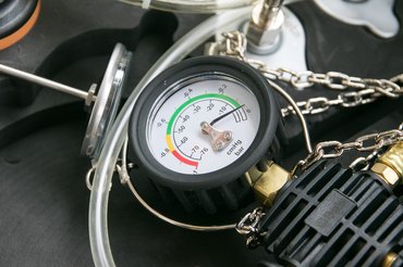 De a hőmérő csak bónusz, a koffer névadó funkciója a tömítettség ellenőrzése. Ez nem túl bonyolult feladat, kell hozzá egy pumpa, egy nyomásmérő, meg a már említett adapterek. Ezek a legfontosabbak, ha nem akarunk bontóból szerzett hűtősapkákat furkálni és felszelepezni, hanem időhatékonyan egy felcsavarással és rövid pumpálással megnézni, hogy ereszt-e valahol a hűtőkör.