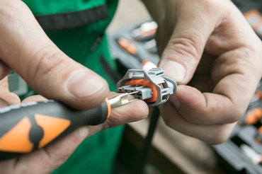 Miután bő ötven éve leszokott az autóipar a csavarozott, szemes saruról és megjelentek a kettőnél több pólusú csatlakozók, valahogy meg kellett oldani, hogy a lapos csúszóérintkező, ami akkoriban univerzálisan elterjedt volt, ne essen ki a műanyag házból. Eleinte egyszerű fület hasítottak ki a hátából, bepattant a helyére, aztán ha ki kellett szedni, elég volt egy műszerész-csavarhúzó. Egy mai autóban a hamutálat is célszerszámmal lehet kibűvészkedni a helyéről, így aztán nem csoda, hogy a csatlakozókhoz is spéci eszközök kellenek.