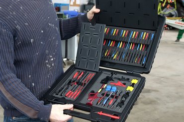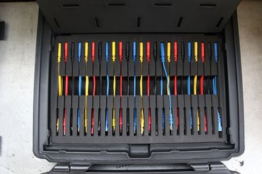 Csak az nem készített még magának lapos saruval végződő mérőzsinórt, aki nem bonyolódott még bele komolyabb elektromos mérésbe az autónál. Ilyenből van vagy négy tucat a kisbőrönd fedelében, a legvékonyabb, 0,6 milliméter szélestől egészen a legszélesebb, 6 milliméteresig. Másik végükön klasszikus banánhüvely, ahonnan már egyenes út vezet a multiméterig, oszcilloszkópig. Ugyanilyen típusú kábelből, kerek, motorkerékpároknál használatos dugasszal a végén, szintén van benne egy kazal.