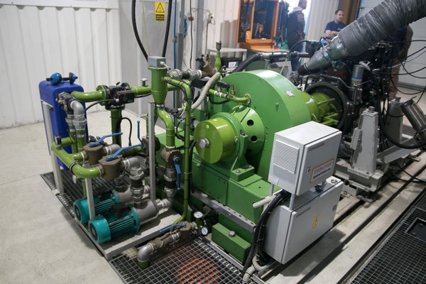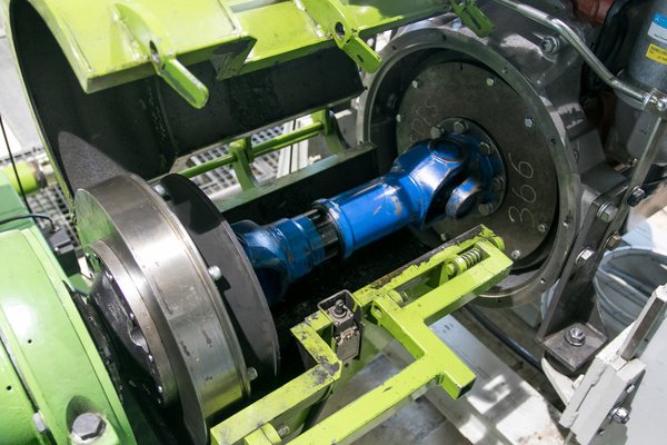 Maga a fékgép nem is olyan vészesen nagy, üstdob-méretű, viszont a köré fonódó kígyófészek már kicsit rémisztő. Kábelek, hűtővíz-szivattyúk, tartályok, elektromos szekrények veszik körül a zöld hengert, és a csövek többsége lefelé távozik. A fékgép és a motor lényegében egy mérőszigeten áll, komoly betonalapon, síneken tologatható állványon. A gigantikus ezüstüstön és a fatörzs vastagságú csőrendszeren keresztül szívja a motor a levegőt.