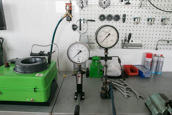 Hogy megnézzük, rendesen működik-e a porlasztó, meglepő módon szükségünk van egy porlasztóvizsgálóra. A régi, adagolós technikánál elég egy karos pumpa, amely képes előállítani úgy 2-300 bart. A kimenetére felcsavarozzuk a porlasztót, a manométeren pedig szemmel követhetjük a nyomás alakulását. Az eszköz annyira primitív, hogy amikor szükségem volt rá, egy délután összehenköltem egy kéttonnás palackos emelőből, egy nyomásmérőből meg némi nyomáscső-nyesedékből.
