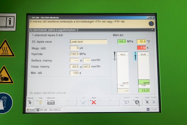 Ezzel a géppel már kétfokozatú porlasztókat is rendesen be lehet mérni, még fontosabb, hogy a közös nyomócsöves dízelek porlasztóival is elbánik. A mérési eljárás nem olyan tenyeres-talpas, mint a karos ropogtatónál, itt érintőképernyőn lehet cikkszám szerint kiválasztani a típust, aztán a gép majd jól elvégzi a mérést. Temperálja az olajat, és szivárgástesztet végez – a lényeg eddig ugyanaz, mint a mechanikus porlasztóknál. Utána viszont ráengedi az üzemi nyomást, és működésbe hozza egy impulzussorozattal. Az elporlasztott, illetve a finoman illesztett alkatrészek között üzemszerűen elszelelő résolaj mennyiségéből aztán kiderül, jól működik-e a porlasztó.