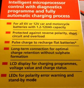 Ez a készülék naná, hogy tölti a 14-120 Ah-s szabvány, 12 voltos autóakksit. De tölti a 14 Ah-nál kisebb motoros akksit is – annak ugyanis teljesen más áram kell. Hoppá, még az AGM-akkukat (spirálcellás és egyéb felitatott, „száraz” elektrolitos) is kezeli, ami a normális akkutöltőkkel gyors akkuhalálhoz vezet. Sőt, tud 6 voltos akkumulátort is tölteni egészen 14 Ah-ig, tehát akinek van otthon egy Pannóniája, Jawája, vagy történetesen NSU OSL-je, egy kiegészítő eszközt lehúzhat a listáról. Egyvalakire nem gondoltak, amikor kifejlesztették a töltőt – a régi, 6 voltos akkukkal szerelt oldtimerek tulajdonosaira – egy régi Trabi, Ford Taunus vagy Volga akkumulátora ugyanis közel tízszer akkora kapacitású (Ah), mint amit ez a töltő tud. Gondolom, azt is feltölti, csak baromi lassan – de erre ne vegyenek mérget.