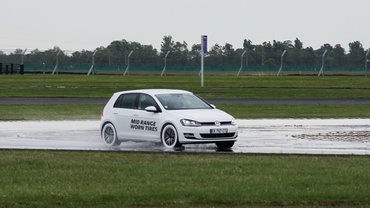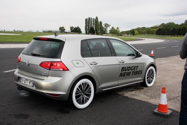 Mivel a gyakorlatot semmilyen elmélet nem helyettesítheti, kimentünk a tesztpályára, ahol felkészített autók vártak minket. Golf VII-es 1.4 TSI-k, háromféle kategóriájú új, és háromféle használt, pontosan a kopáshatár-jelzőig koptatott gumikkal, a gumik mérete egyaránt 205/55-ös volt, 16 colos felnin. A márka és típus jelzését mindről eltávolították, és el is takarták, hangsúlyozták, hogy az itt most mindegy: ez nem egy Michelin promóció.