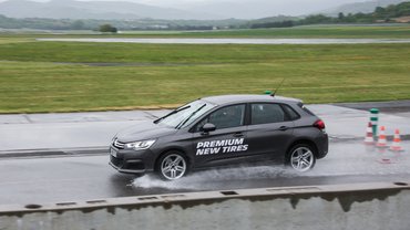Később a három árkategóriát vizes fékezésnél is összehasonlítottuk, ekkor már nem mi, hanem hivatalos tesztelők fékeztek, szintén Citroënekkel. A féktávra csak a gumi minősége volt befolyással, a futófelület mélysége nem, ez tisztán látszott. Az is jól látszott, hogy a prémium kategóriás gumi nem tud annyira kopott lenni, hogy ne győzze le az olcsó gumit. Az is látszott a fékteszten, hogy az olcsó abroncs a kopással nagyon sokat veszít a teljesítményéből, a prémium kevésbé. A mérnök ezt azzal magyarázta, hogy az olcsó abroncs tapadását nagyobb mértékben határozza meg a minta kapaszkodóképessége, mint a gumi anyaga, a prémium guminál pedig az anyag az, ami tapad - a mintázat csak segíti kedvezőtlen körülmények között.
