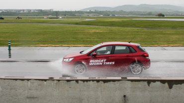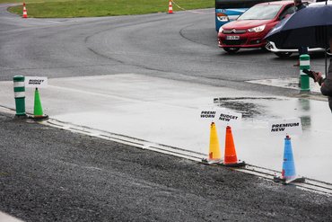 A következő feladat vizes fékezés volt 95 km/h-ról állóra. A pályán 2 mm vastag vízréteg, a felület szinte tükörsima. Itt más gumiabroncsokkal szerelt olcsó, közepes árú és prémium feliratos Citroënek voltak. Ahogy a vizes talajra futottunk, a kopott gumik esetében lehetett egy kis bizonytalanságot, kezdődő vízenfutást érezni, azonban a kopott prémiumabroncs így is öt méterrel előbb állt meg, mint az új olcsó. A kopott és új gumi között volt egy méter eltérés az új javára.
